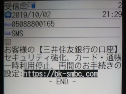 二日連続で謎のSMSを受信したのでご報告です。今日の不審なSMSは三井住友銀行を騙るメールでした。