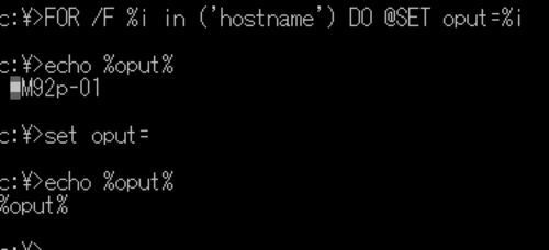 バッチファイル内であるコマンドの実行結果で得られるコンピュータ名の情報を変数に入れたいと思ったときにやってみた方法をご報告します。