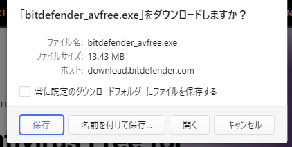 画面上にダウンロード開始メッセージ(ファイル名:bitdefender_avfree.exe)が表示され、