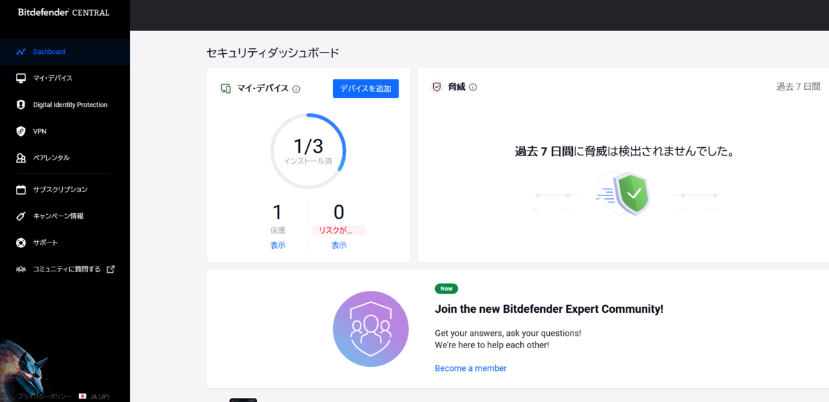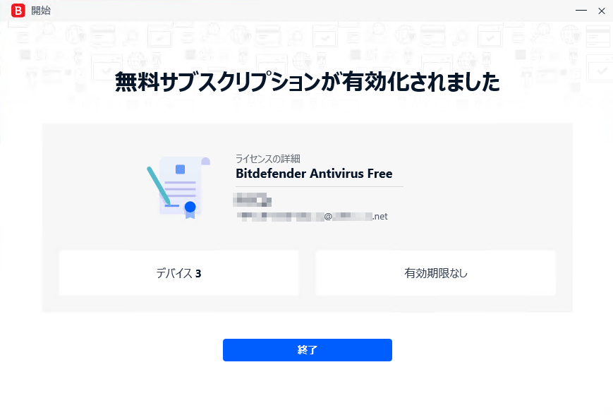 Bitdefenderフリー版が有効化されました。1アカウントの登録で三台のデバイスまでがBitdefenderで保護できるようです。有効期限なしという表示も見て取れます。