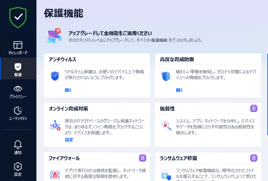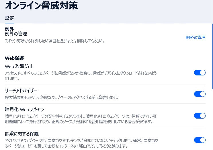 例えば、「オンライン脅威対策」の設定画面を開くと、