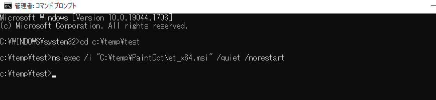 だとすると、「管理者として実行」したコマンドプロンプトから実行すればいいということ?と思い、もう一度「管理者:コマンドプロンプト」から再度上記の"msiexec /i "C:\temp\PaintDotNet_x64.msi" /quiet /norestart"を実行してみました。