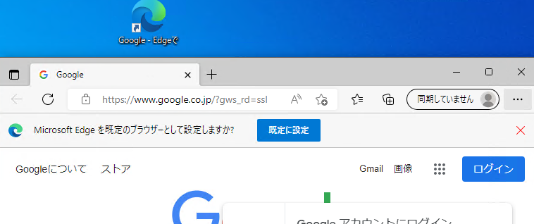 ※Edgeの画面上に既定のブラウザ設定を促すメッセージが表示されていますが、これを既定に設定するとEdgeが通常使うブラウザとなるので注意。