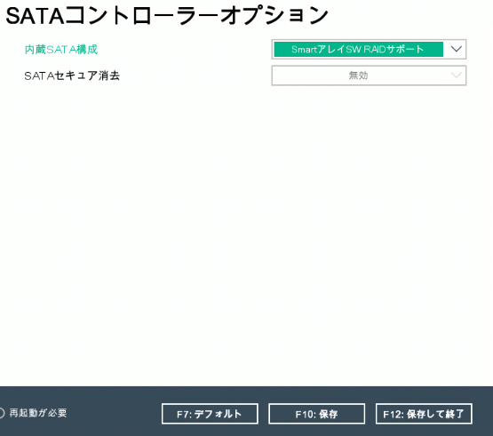 「Smartアレイ SW RAIDを有効にすると、既存のSATAドライブでデータ損失やデータ破損が発生します。」という注意書きなどが表示されました。