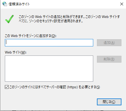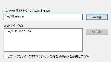 信頼済みサイトの登録画面で「このゾーンのサイトにはすべてサーバの確認(https:)を必要とする」のチェックを外して、該当のサーバ(イントラネット上のファイルサーバ)を登録します。