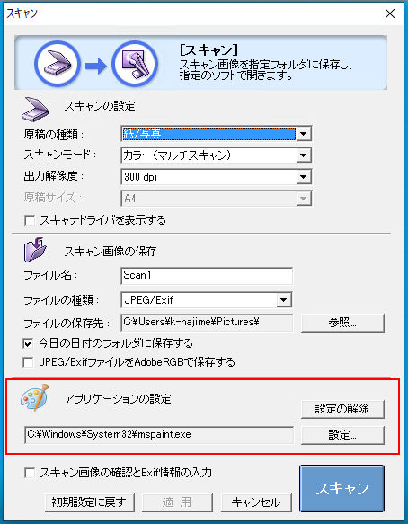 スキャンボタンにペイント(mspaint.exe)とPaint.netを割り当てておきます。