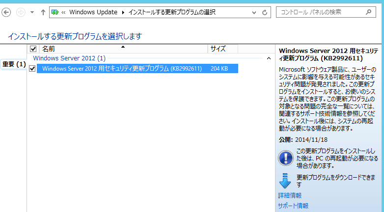 KB2992611が検出されて、適用対象としてあげられています。ひょっとしてこれの適用が走ったせいで今回の症状が発生したんじゃないかと考えました。