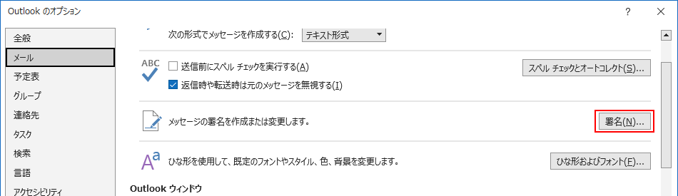 Outlookのオプション画面で「メール」を選択後に右画面で「署名」をクリック)してみると、