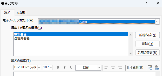 署名を新しく作成します。このとき以前設定されていた署名の設定名と同じ名前を指定すると、