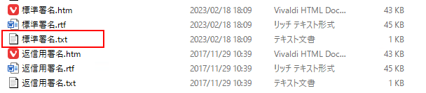 署名データ自体が消えているわけではないので、先ほど確認した<%USERPROFILE%\AppData\Roaming\Microsoft\Signatures>に格納されている署名ファイルの.txt拡張子のファイルを開いて、