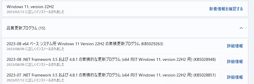 - 2023-08 x64 ベース システム用 Windows 11 Version 22H2 の累積更新プログラム (KB5029263)