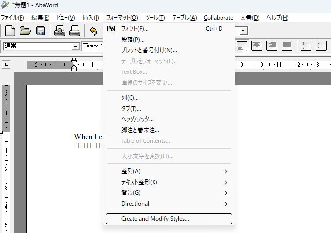 ちょっと不便なデフォルトのフォント「Times New Roman」は日本語が文字化けするので、使うたびにお望みのフォントを指定してAbiWordが起動してくるように設定してみます。