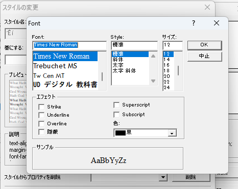 ここでどうやらデフォルトのフォントを指定できるようです。「Times New Roman」となっているフォントの指定を希望のものに変更します。