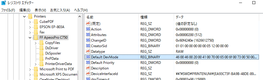 にあるキーの「Default DevMode」という値に印刷設定が保存されていることが分かりました。