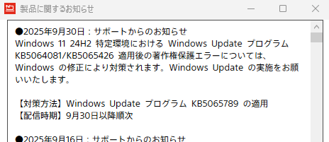 Windows 11 24H2 特定環境における Windows Update プログラム KB5064081/KB5065426 適用後の著作権保護エラーについては、Windows の修正(Windows Update)により対策が予定されています。修正時期は確定次第お知らせいたします。今しばらくお待ちください。